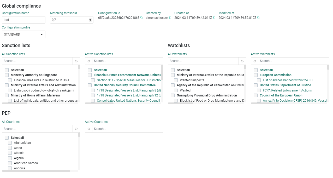 The AML Guard requires some upfront configuration. You may select just the default configuration that is shipped with the standard. However, you are free to define custom configurations in case you want to adjust matching score thresholds as well as the sanction and watchlists that should be considered.